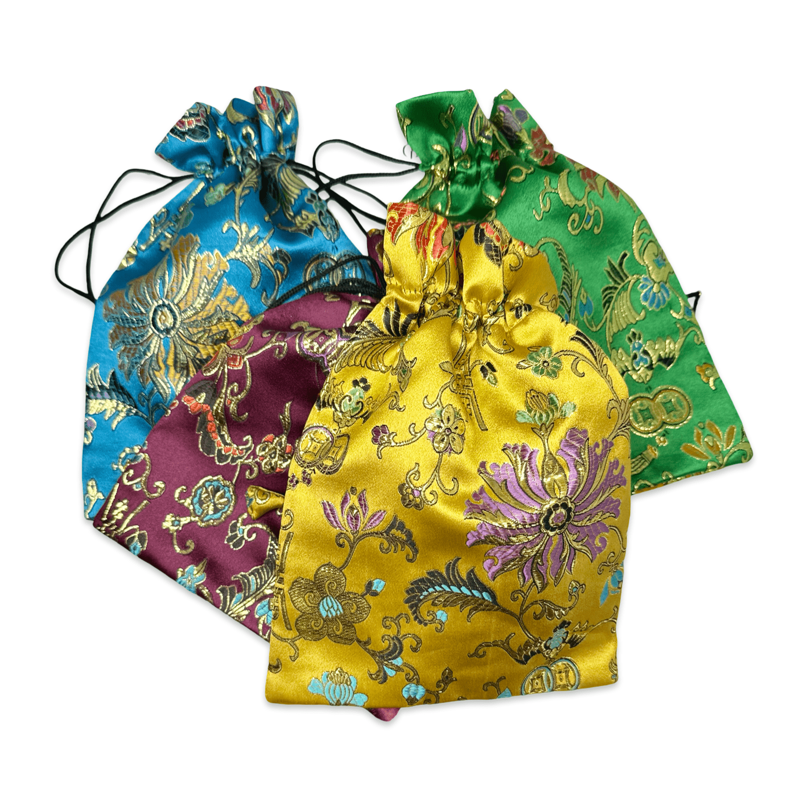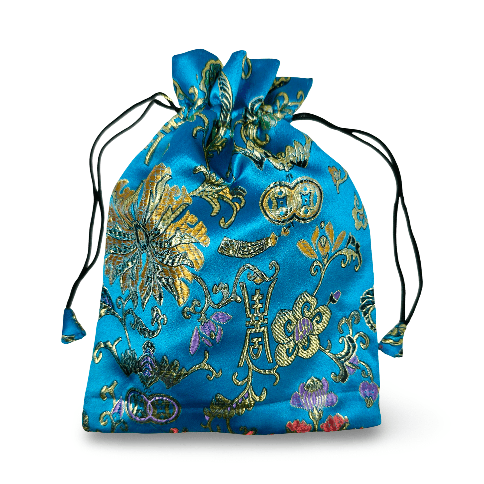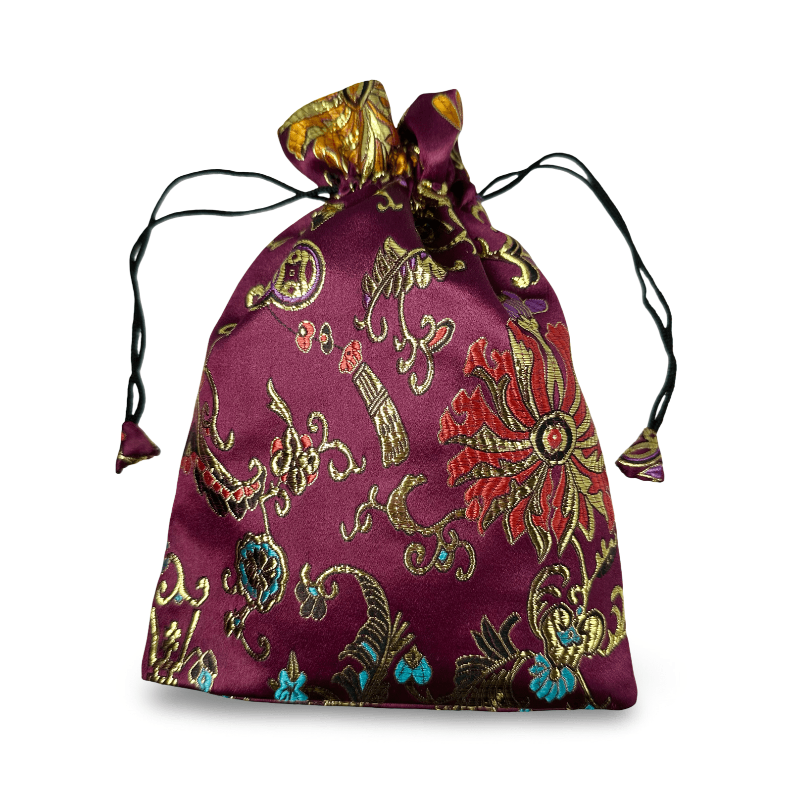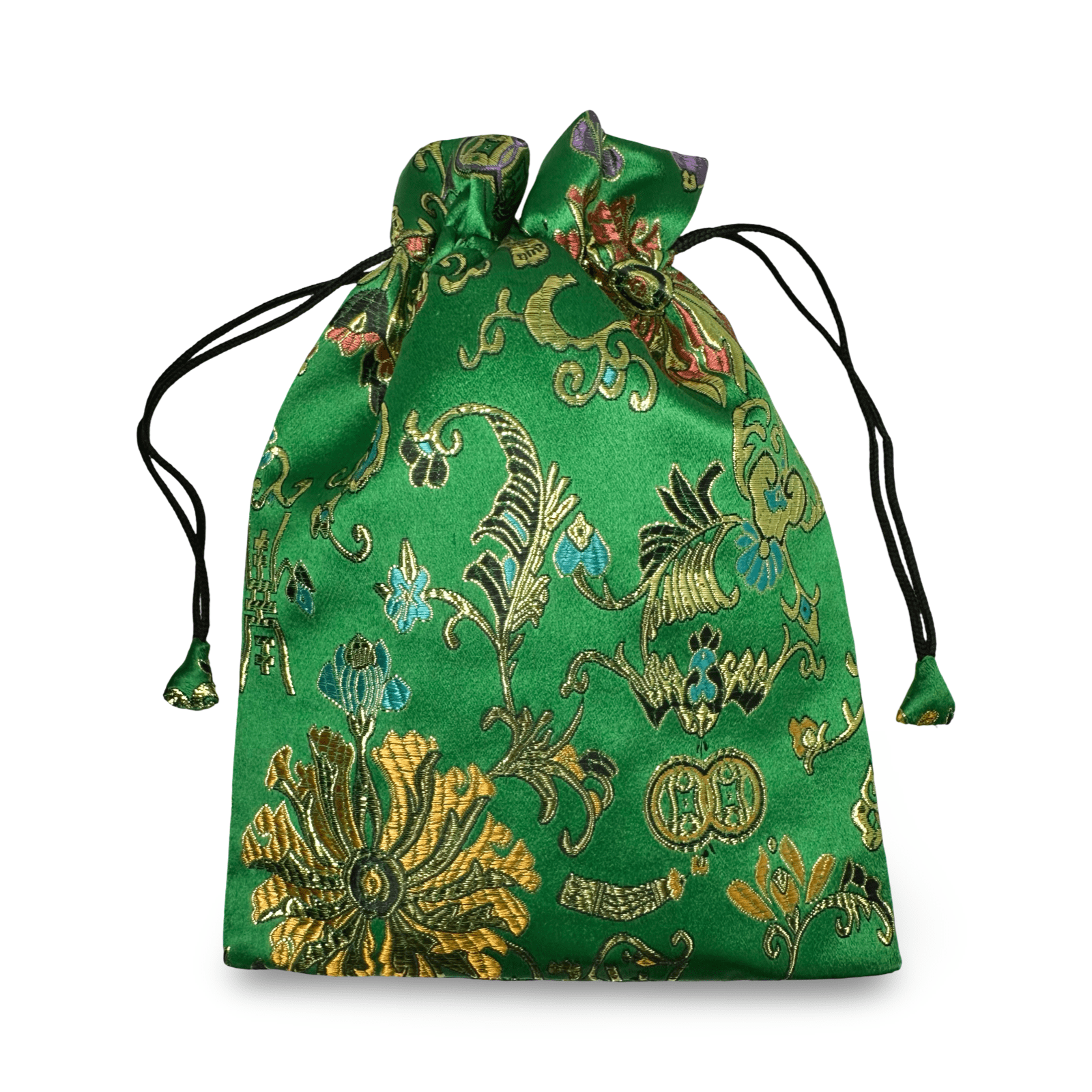 Pochette en brocart ornée d'un motif tibétain traditionnel tissé, idéale pour ranger de petits objets comme des bijoux, un mala (chapelet de prière) ou comme élégant sac cadeau. Confectionnée en soie végétale, elle se ferme à l'aide de deux cordons et est fabriquée au Népal.