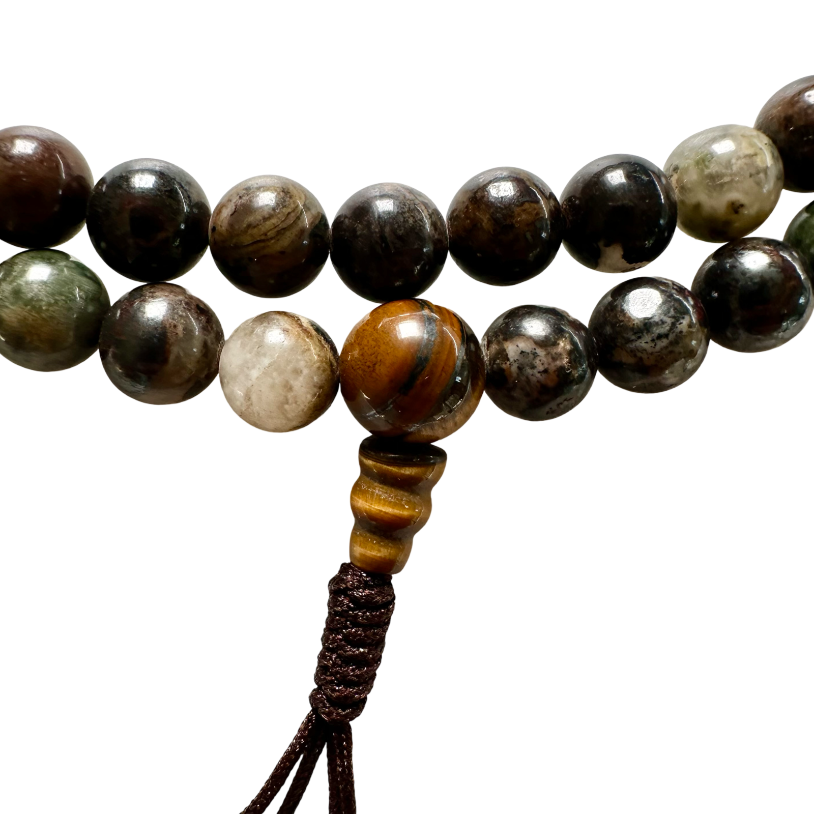 Un mala exquis composé de 108 perles de jade mongol soigneusement sélectionnées et polies, reliées par deux cordons brun foncé. Le mala mesure environ 90 cm de circonférence et les perles de jade ont un diamètre d'environ 8 mm. Ce collier de prière est confectionné artisanalement dans un atelier népalais traditionnel réputé pour son savoir-faire d'exception. Chaque mala est livré dans une luxueuse pochette en brocart de soie, choisie avec soin pour s'harmoniser avec les couleurs.