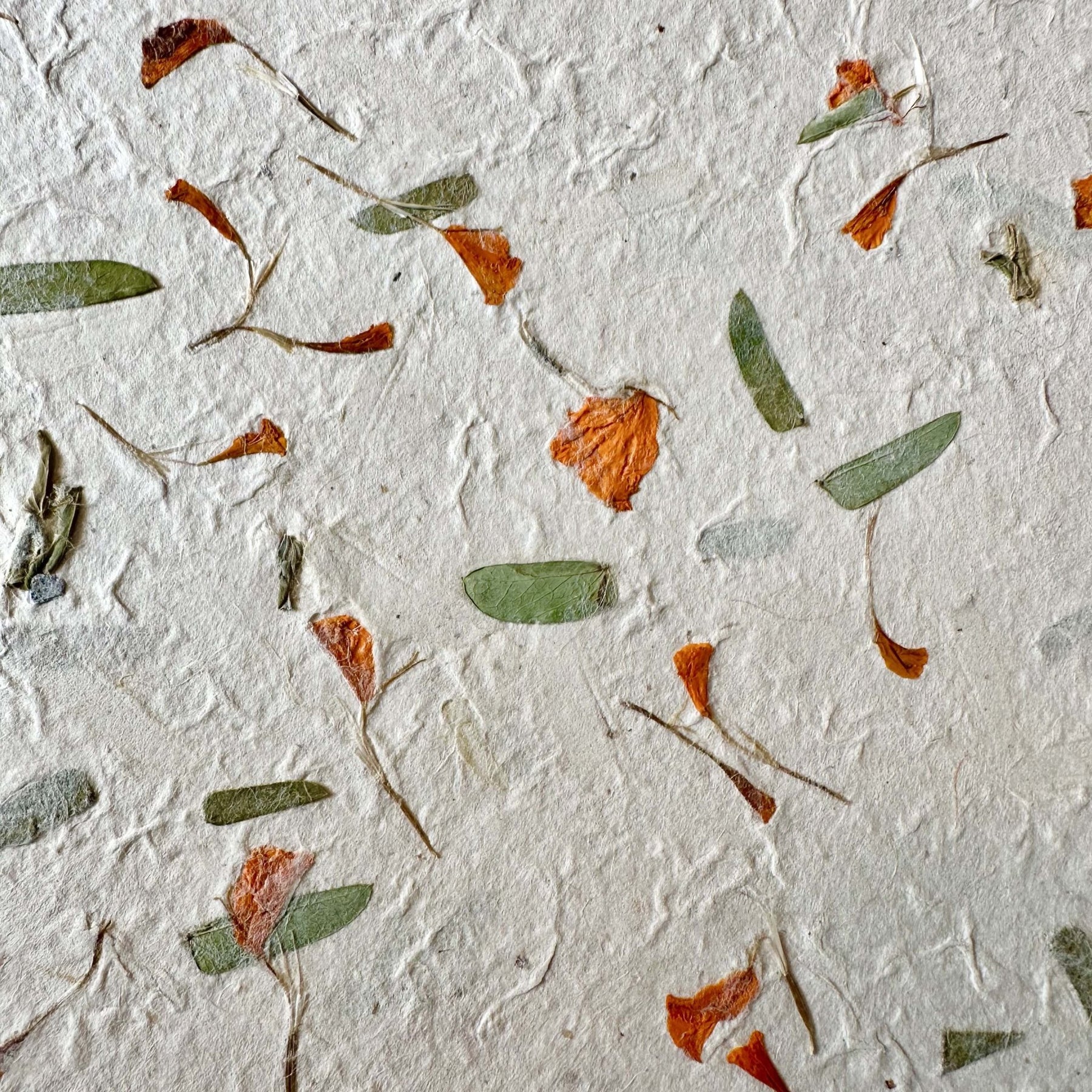 Ce papier Lokta de couleur naturelle est fabriqué à la main avec amour, en intégrant soigneusement de véritables fleurs et herbes. Celles-ci sont récoltées et séchées à la main dans le village reculé de Ramechhap, à environ 130 km de Katmandou, puis directement intégrées à la fabrication du papier.