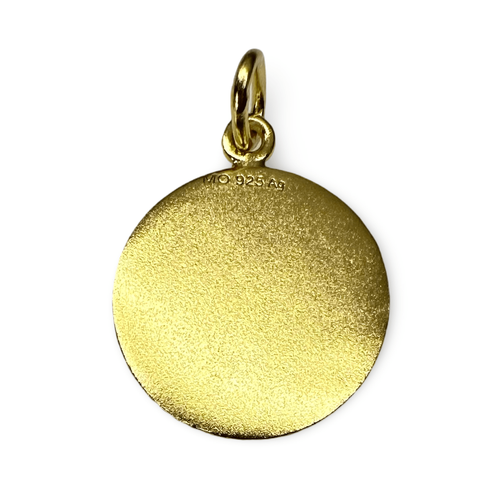 Ce pendentif rond présente un délicat ornement sur le devant, composé de fins motifs sphériques disposés de manière concentrique, qui lui confère structure et profondeur. Le dos est lisse et mat. Le pendentif est en argent et entièrement plaqué or. Son diamètre est de 16,5 mm et son œillet de 3 mm convient aussi bien aux chaînes fines qu'aux bracelets plus épais.