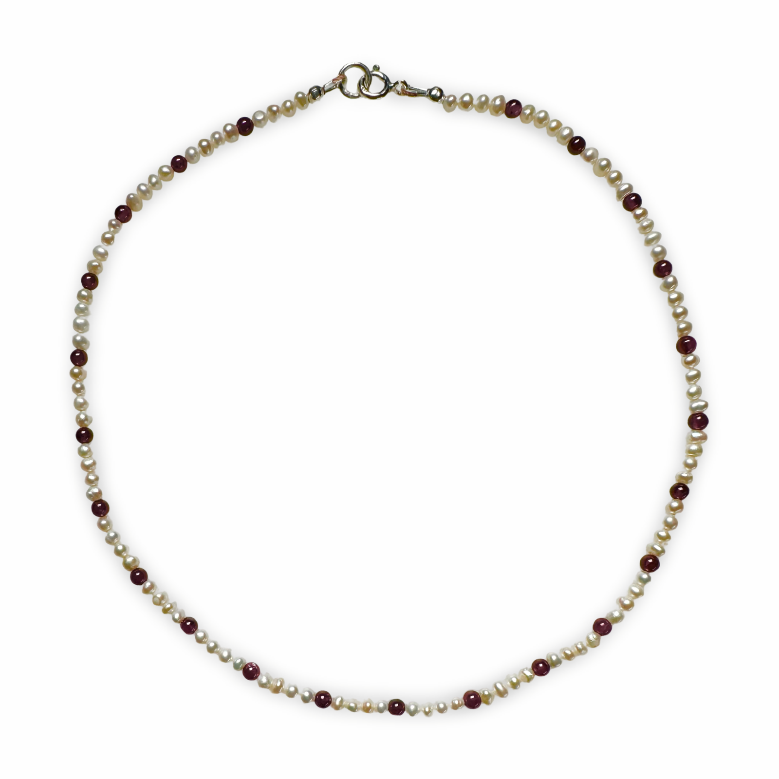 Un joli collier composé de petites perles d'eau douce et de grenat, d'environ 4 mm de diamètre. Disponible en deux tailles (dont une pour enfant), il se ferme par un fermoir à ressort argenté. Sa circonférence est de 35 cm. Fabriqué artisanalement dans l'atelier Tibet à Zurich.