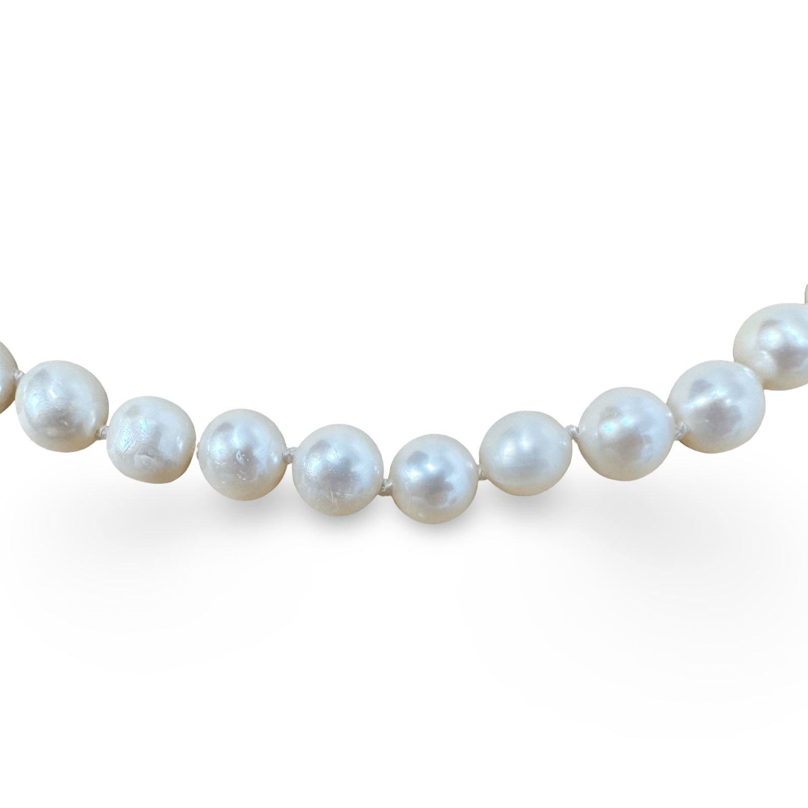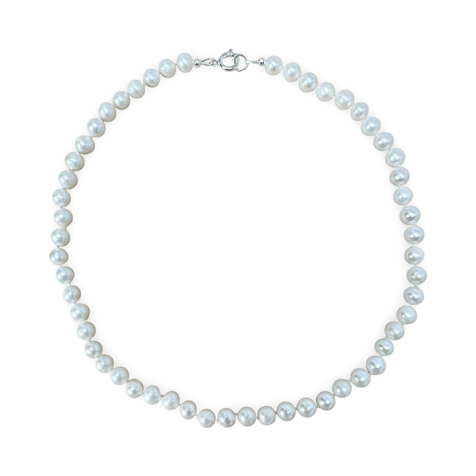 Collier de perles d'eau douce d'environ 7 mm de diamètre. D'une circonférence de 43 cm, il se ferme par un fermoir à ressort en argent. Fabriqué artisanalement dans l'atelier Tibet à Zurich.