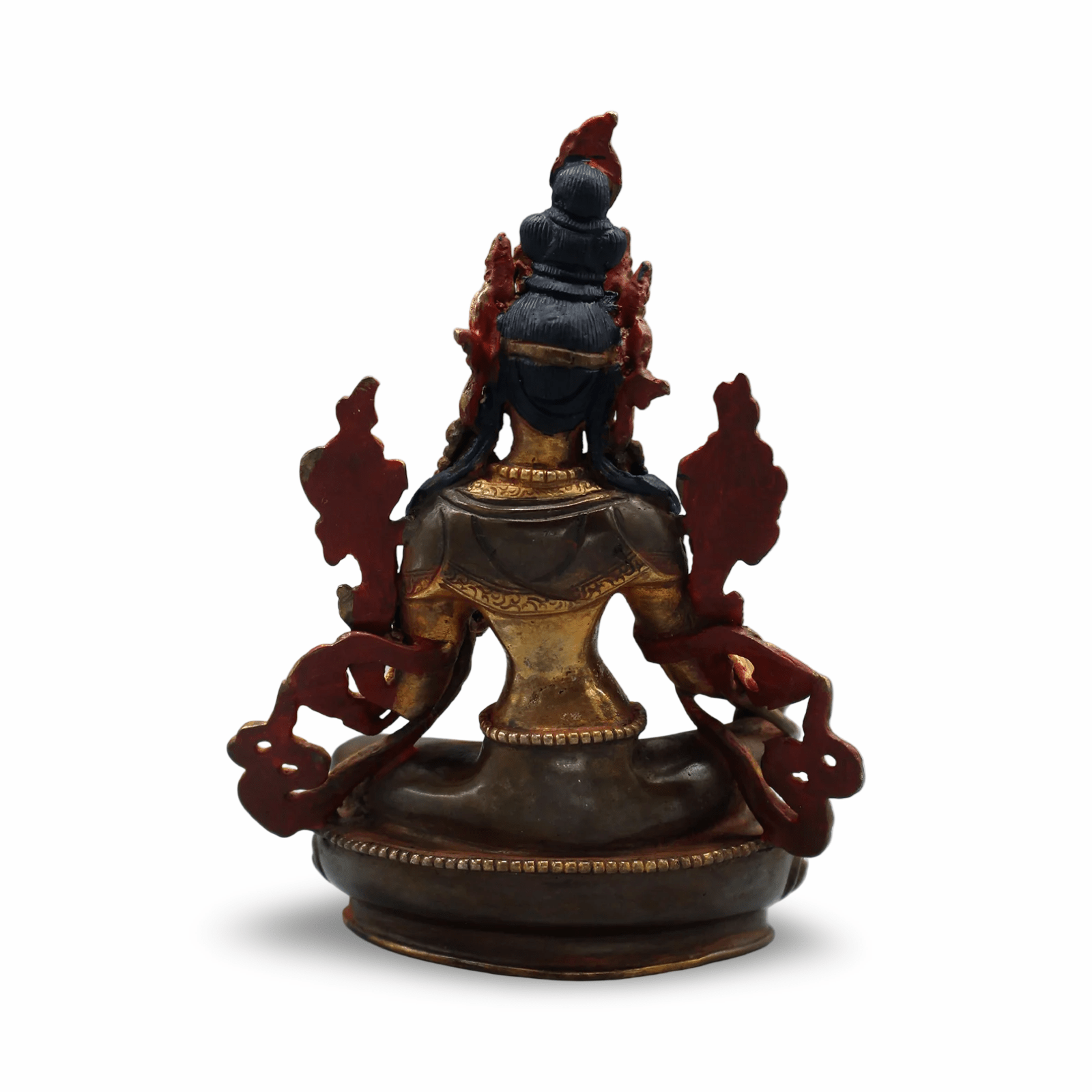 Cette statue de Tara Verte, réalisée avec art, est une pièce unique. Coulée à la main en cuivre massif par des artisans qualifiés au Népal, elle est ensuite partiellement dorée.