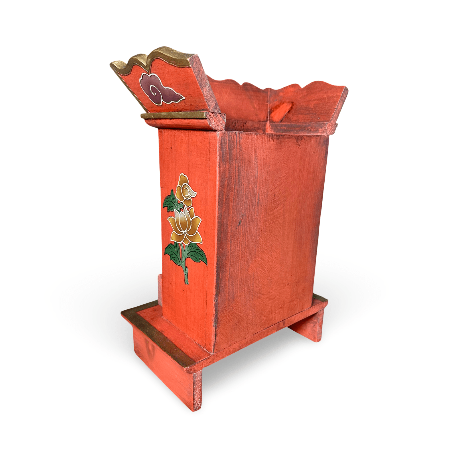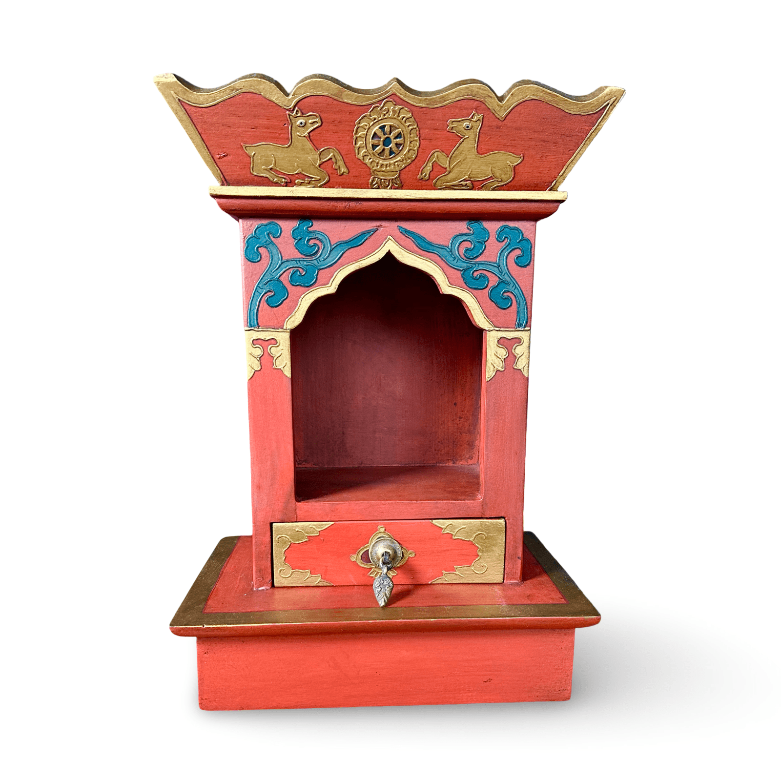 Die Dachzone ist profiliert und mit vergoldeten Kanten versehen. Seitliche und frontale Ornamente sind dekorativ ausgearbeitet und bemalt. Unterhalb der Nische befindet sich eine kleine Schublade mit Metallgriff, geeignet zur Aufbewahrung von Räucherwerk, Gebetszetteln oder kleinen Ritualgegenständen.