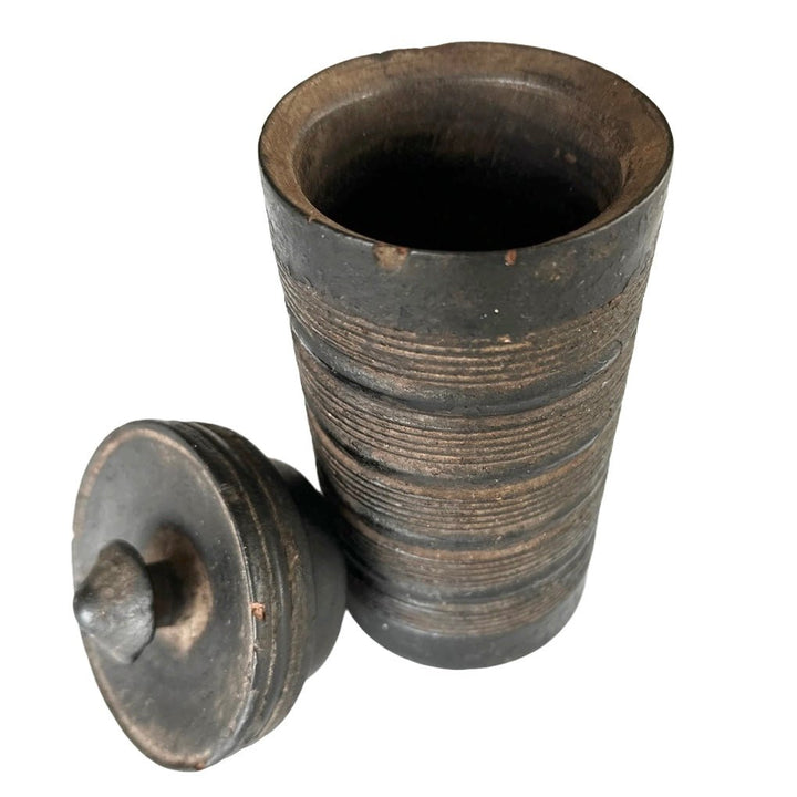 Vecchio vaso di ghee in legno realizzato a mano, probabilmente della tribù Hunza. Il ghee è un burro chiarificato originario dell'antica India ed è comunemente usato nella cucina araba e dell'Asia meridionale, nella medicina tradizionale e nei rituali religiosi. Il Ghee si ottiene facendo bollire il burro ottenuto dalla panna ed eliminando i residui liquidi. La consistenza, il colore e il gusto del burro chiarificato dipendono dalla qualità del burro, dalla provenienza del latte utilizzato e dalla durata della cottura. Lo scopo del burro chiarificato è quello di chiarire il burro in modo che non si rovini. Nella cultura indù, la mucca è sacra e il burro è l'unico grasso animale mangiato dagli indù.