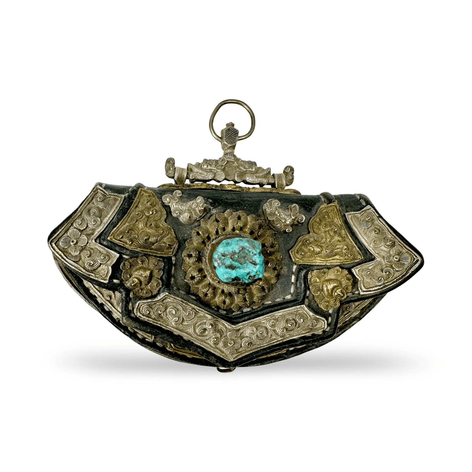 La borsa è realizzata in pelle nera e rossa e riccamente decorata con applicazioni in metallo sbalzato. I delicati ornamenti raffigurano motivi floreali e nuvole, tipici della lavorazione dei metalli tibetana. Una grande pietra turchese, considerata una pietra protettiva e simbolo di purezza spirituale, adorna la parte anteriore.