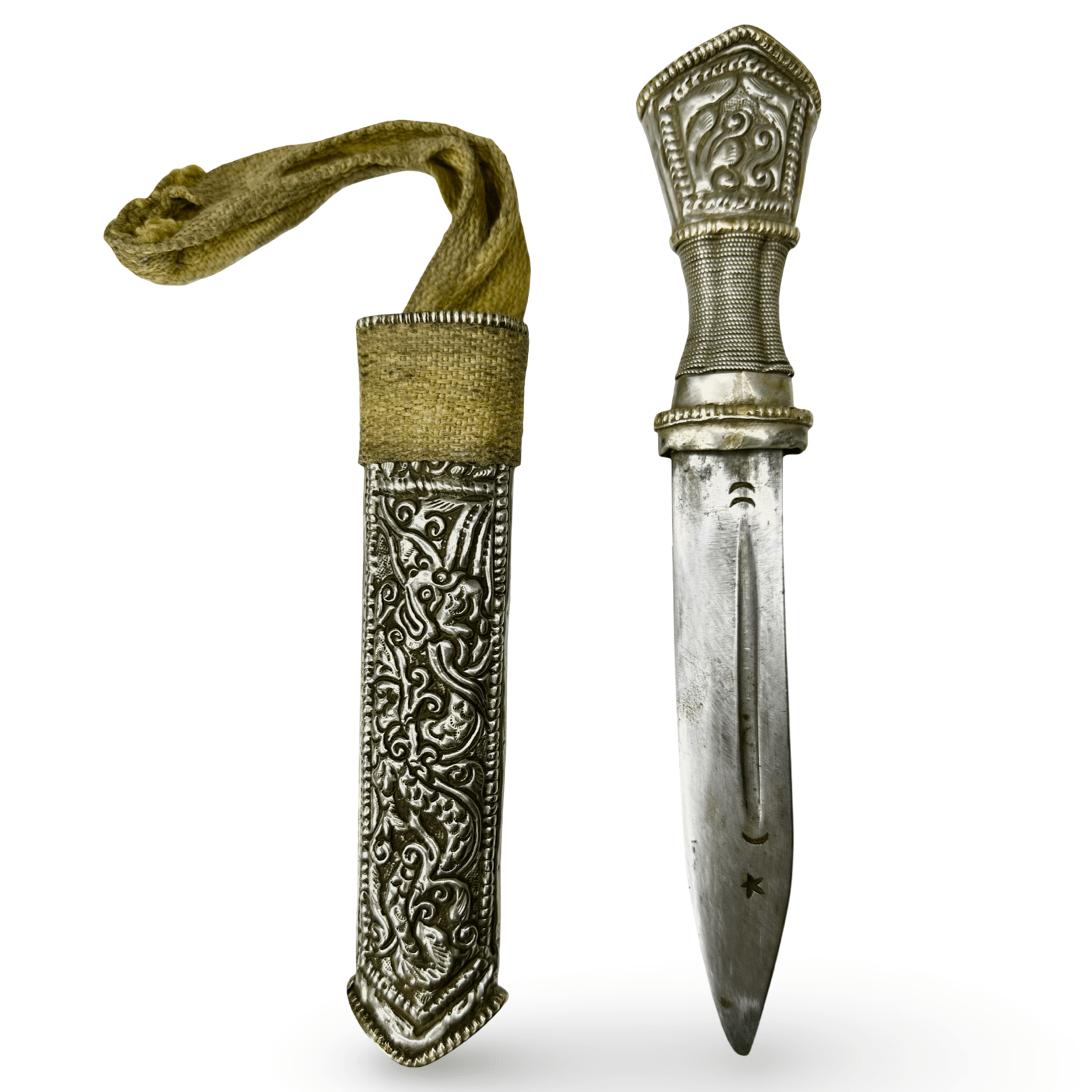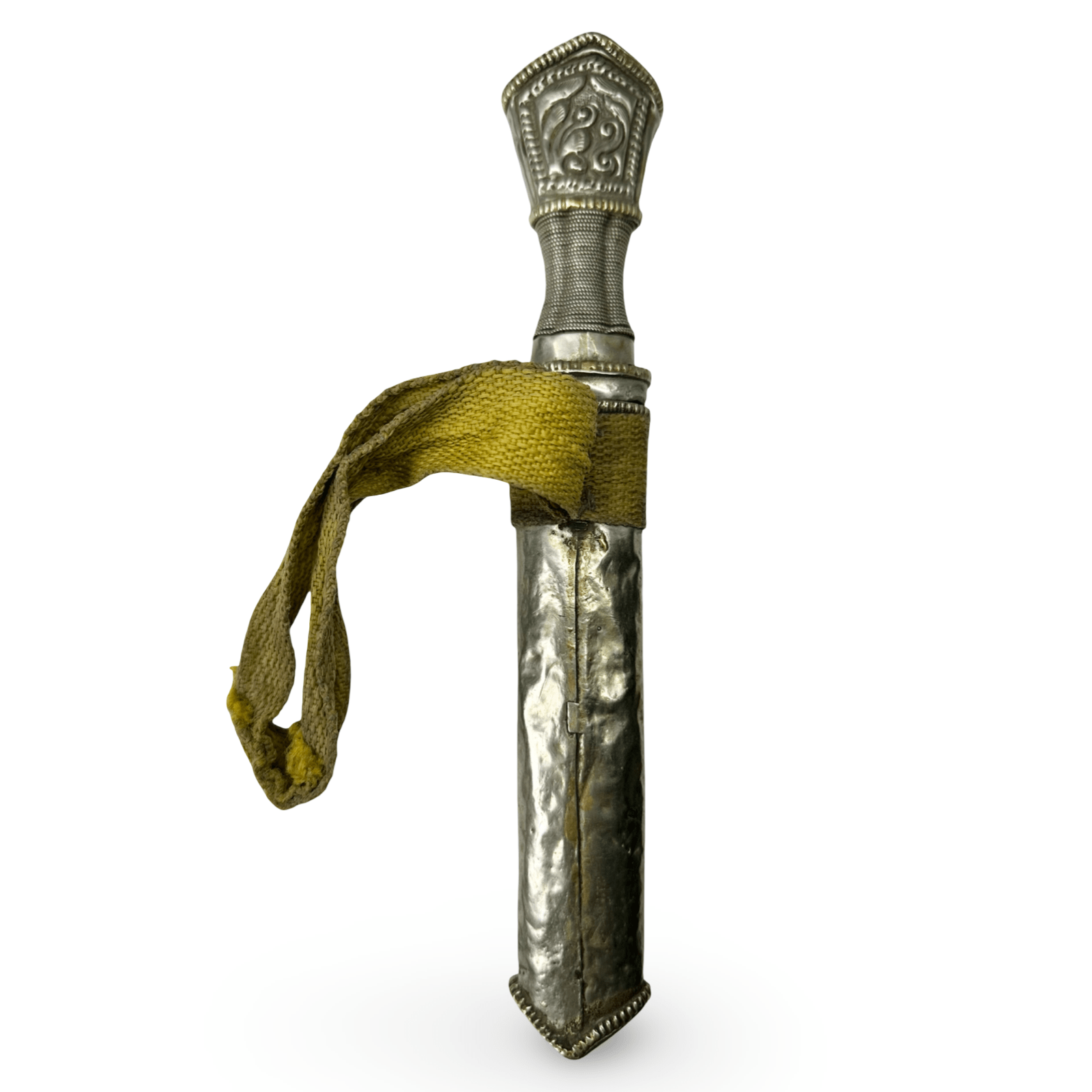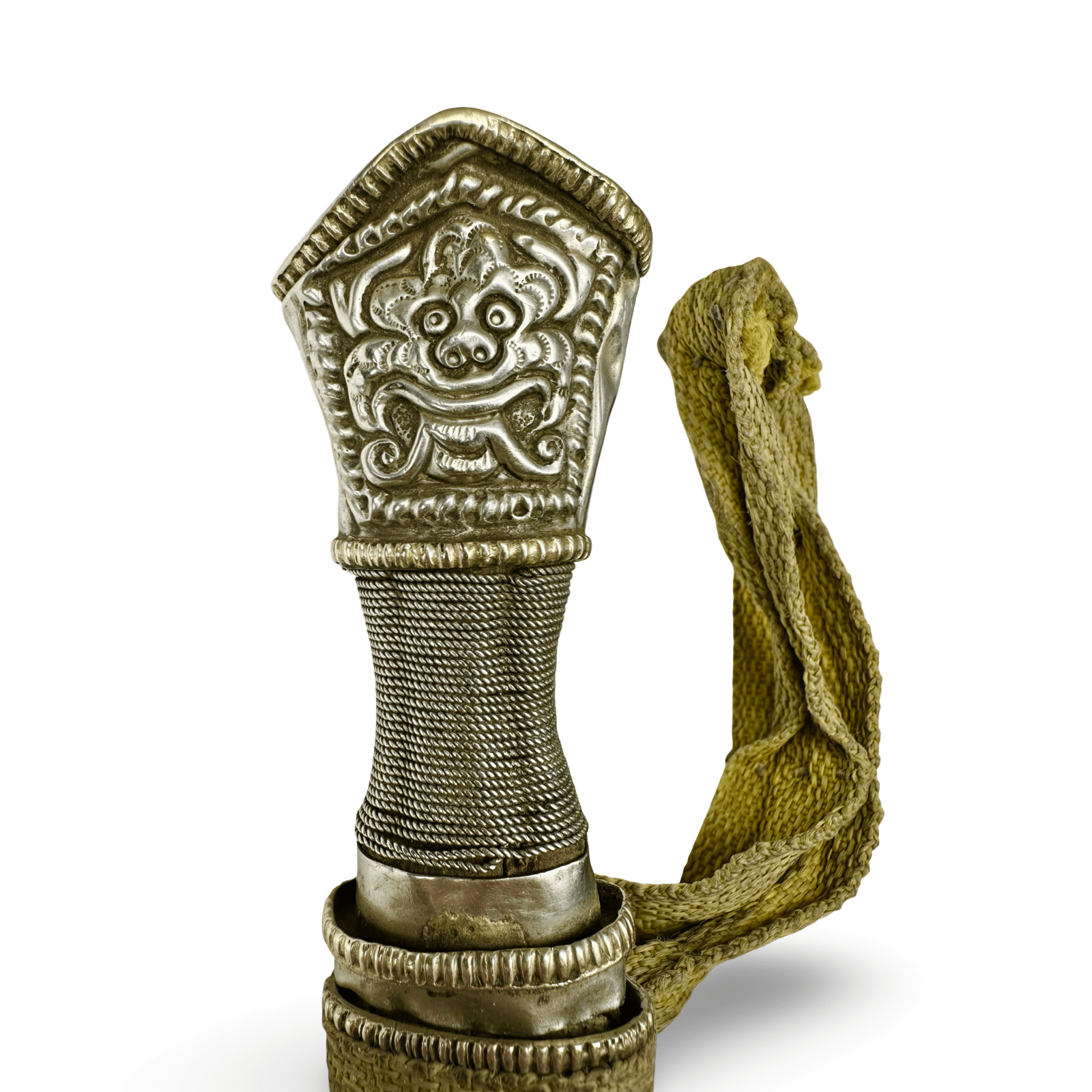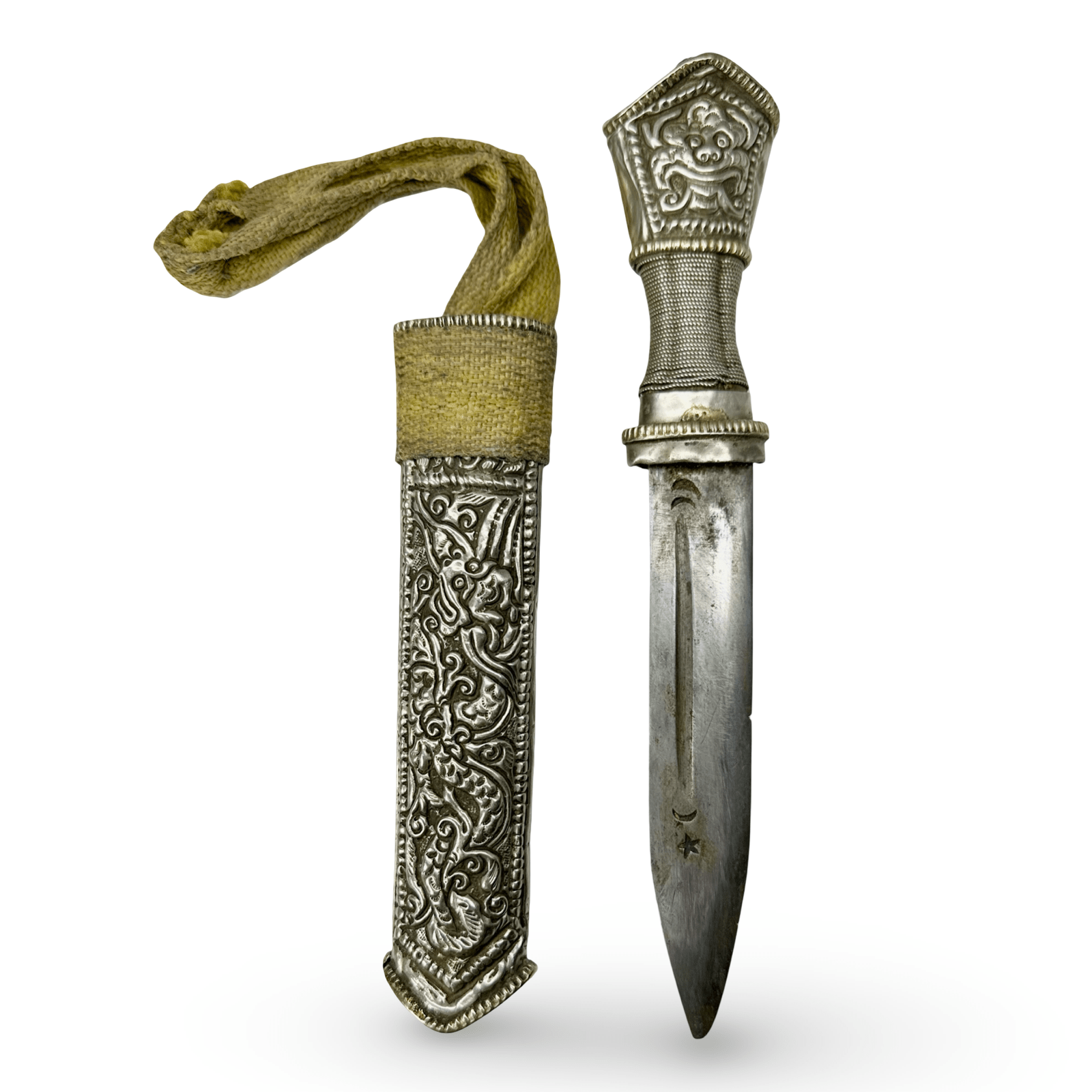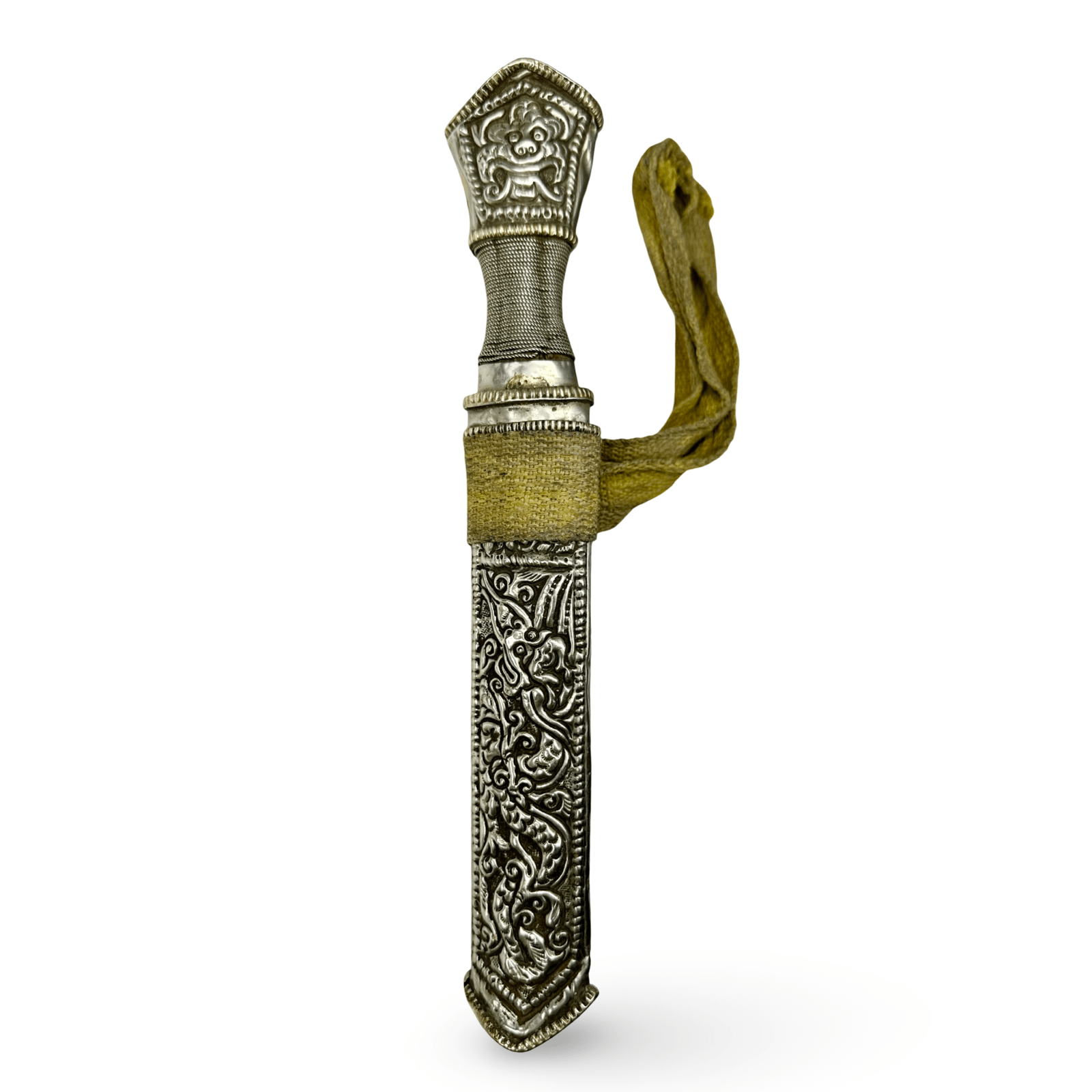 Pugnale tibetano (Gri Gu) finemente lavorato, con fodero e impugnatura in metallo bianco riccamente decorati, decorati con motivi sbalzati e incisi raffiguranti creature mitologiche e simboli protettivi. L'impugnatura è avvolta in filo d'argento intrecciato e termina con un pomolo decorato con un motivo stilizzato di un leone delle nevi, simbolo tradizionale di coraggio e gioia.