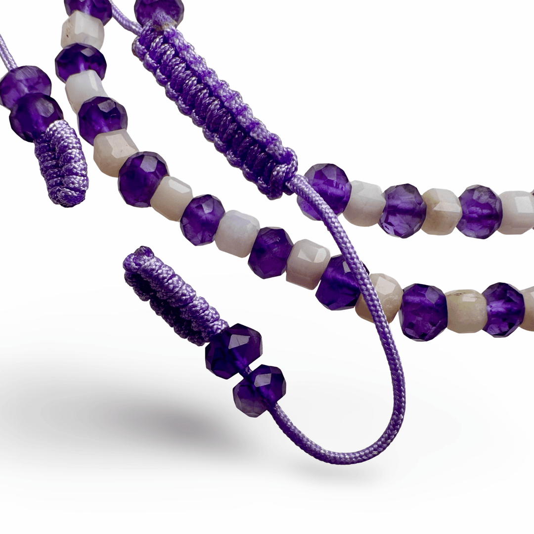 Cavigliera realizzata con perle sfaccettate di ametista e opale rosa dal diametro di 3 mm, che scintillano alla luce, su un cordino viola.