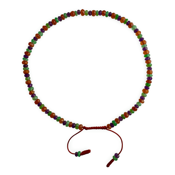 Cavigliera realizzata con perle sfaccettate di corniola, ametista e crisoprasio del diametro di 3 mm, che scintillano alla luce, su un cordino rosso.