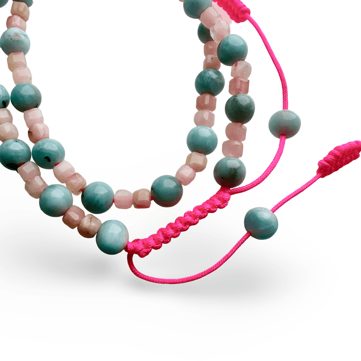 Cavigliera realizzata in Larimar da 3 mm di diametro e perle sfaccettate di Opale rosa che scintillano alla luce, su un cordino rosa.