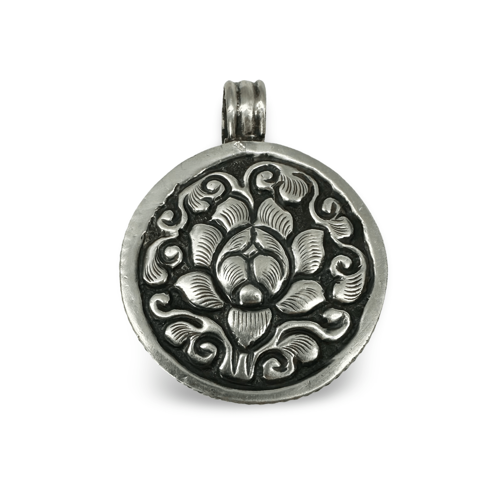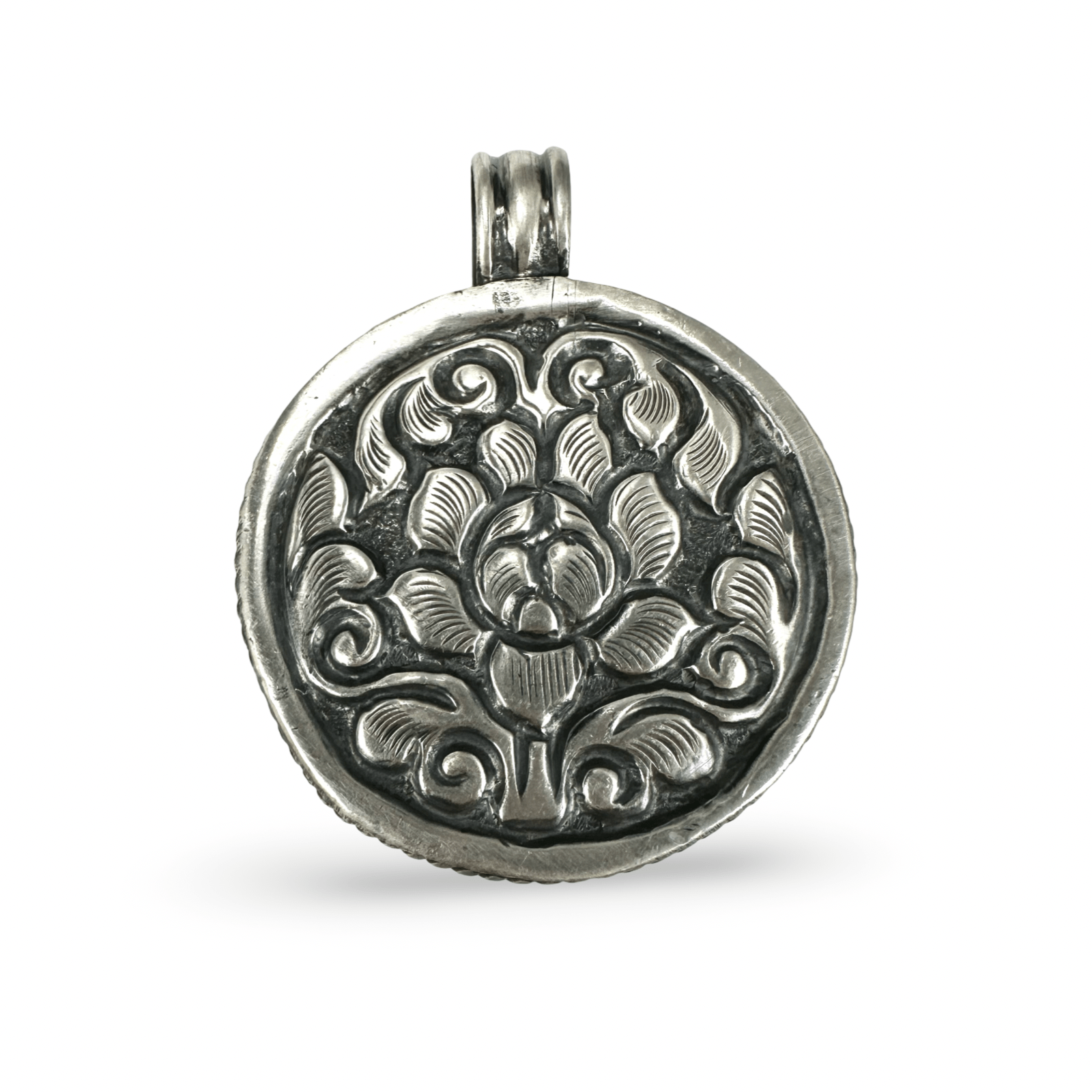 Grande pendente realizzato con un turchese rotondo incastonato in argento. La parte anteriore presenta un fiore in argento con un corallo incastonato, mentre la parte posteriore presenta un motivo vegetale. L'altezza (incluso l'anello) è di 3,7-4 cm e il diametro dell'anello è di circa 7 mm. Il pendente si abbina, ad esempio, alle catene a serpente in argento di Atelier Tibet (vendute separatamente). È realizzato a mano per noi in un tradizionale laboratorio tibetano di lavorazione dell'argento in Nepal.