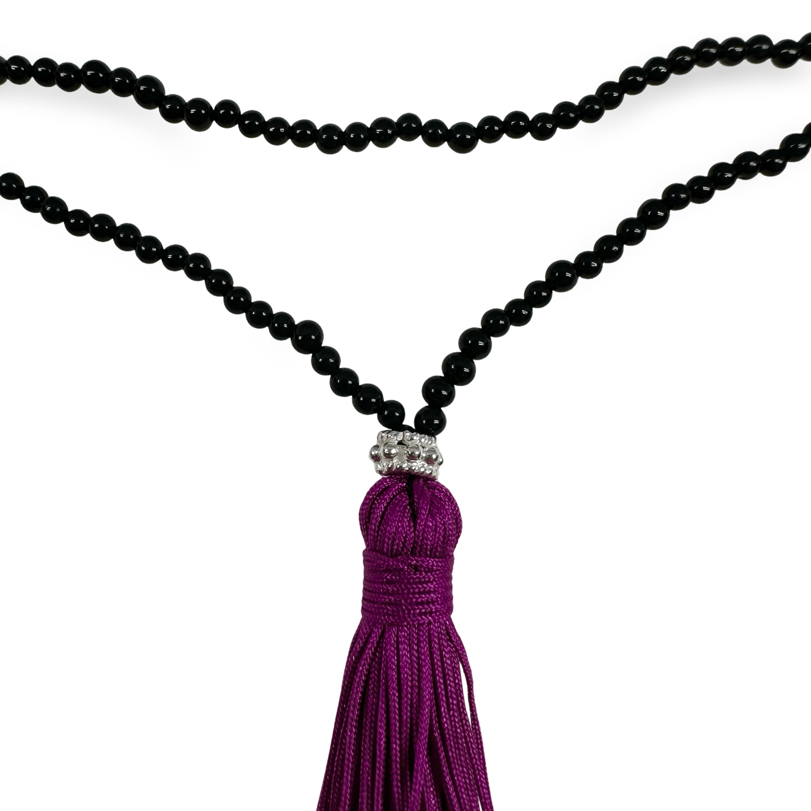 Collana lunga e delicata realizzata con perle di onice di 2 mm di diametro, con nappa magenta e perla d'argento. La collana ha una circonferenza di 72 cm. È realizzata a mano nell'atelier Tibet di Zurigo.