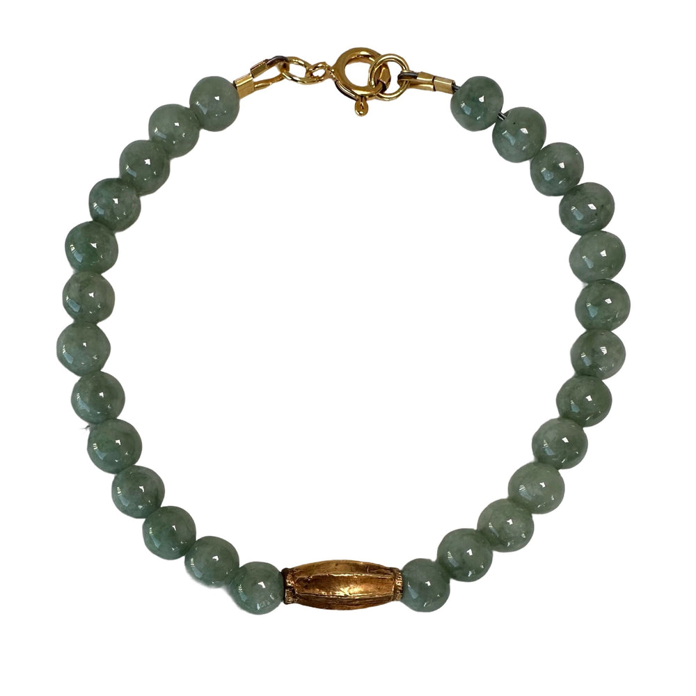 Bracciale realizzato con perle di giada selezionate ( Ø6mm ). Si tratta di un'antica perla indiana cilindrica, lavorata molto finemente, realizzata in oro puro (18 carati, 5 x 13 mm) . A scelta elastico o con chiusura a molla in argento placcato oro. Annodato a mano presso l'Atelier Tibet di Zurigo.