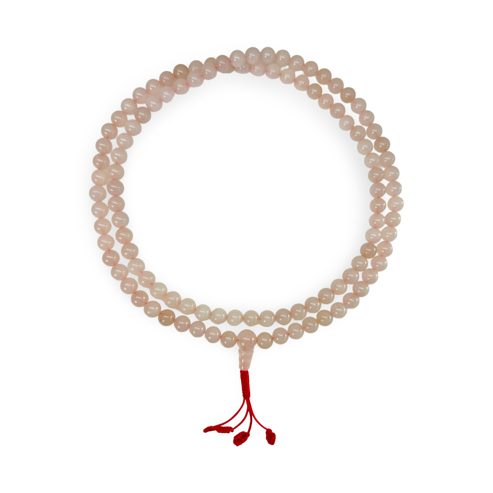 Perle di preghiera tibetane con 108 perle di quarzo rosa lucido selezionate con quattro cordoni rosa o due rossi. Il mala ha una lunghezza di ca. 90 cm, le perle hanno un diametro di ca. È realizzato per noi in un laboratorio tradizionale in Nepal. Consegniamo il mala in un'elegante borsa in broccato di seta, che selezioniamo individualmente in un colore coordinato.