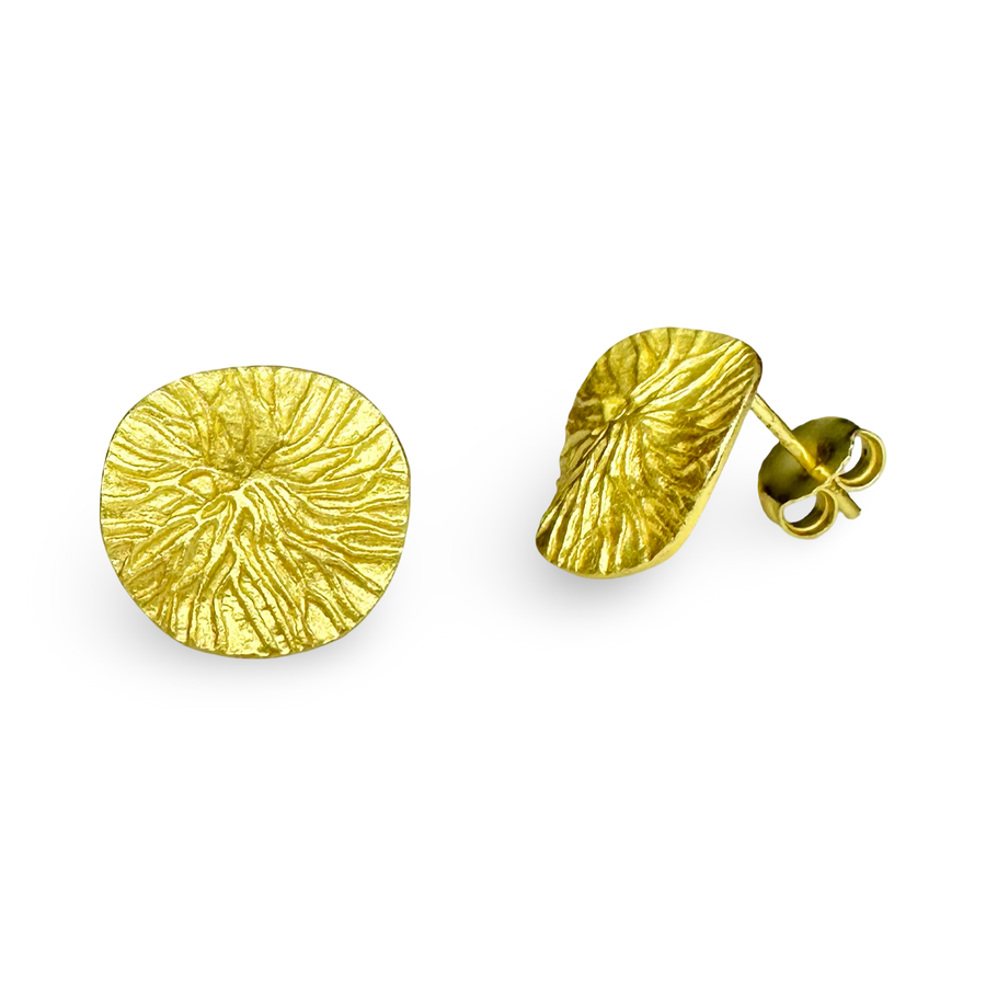 Eleganti orecchini a lobo in argento placcato oro dalla forma organica e leggermente curva, con un delicato motivo a foglia. Il diametro è di circa 15 mm. Questo gioiello è realizzato a mano per noi in India.