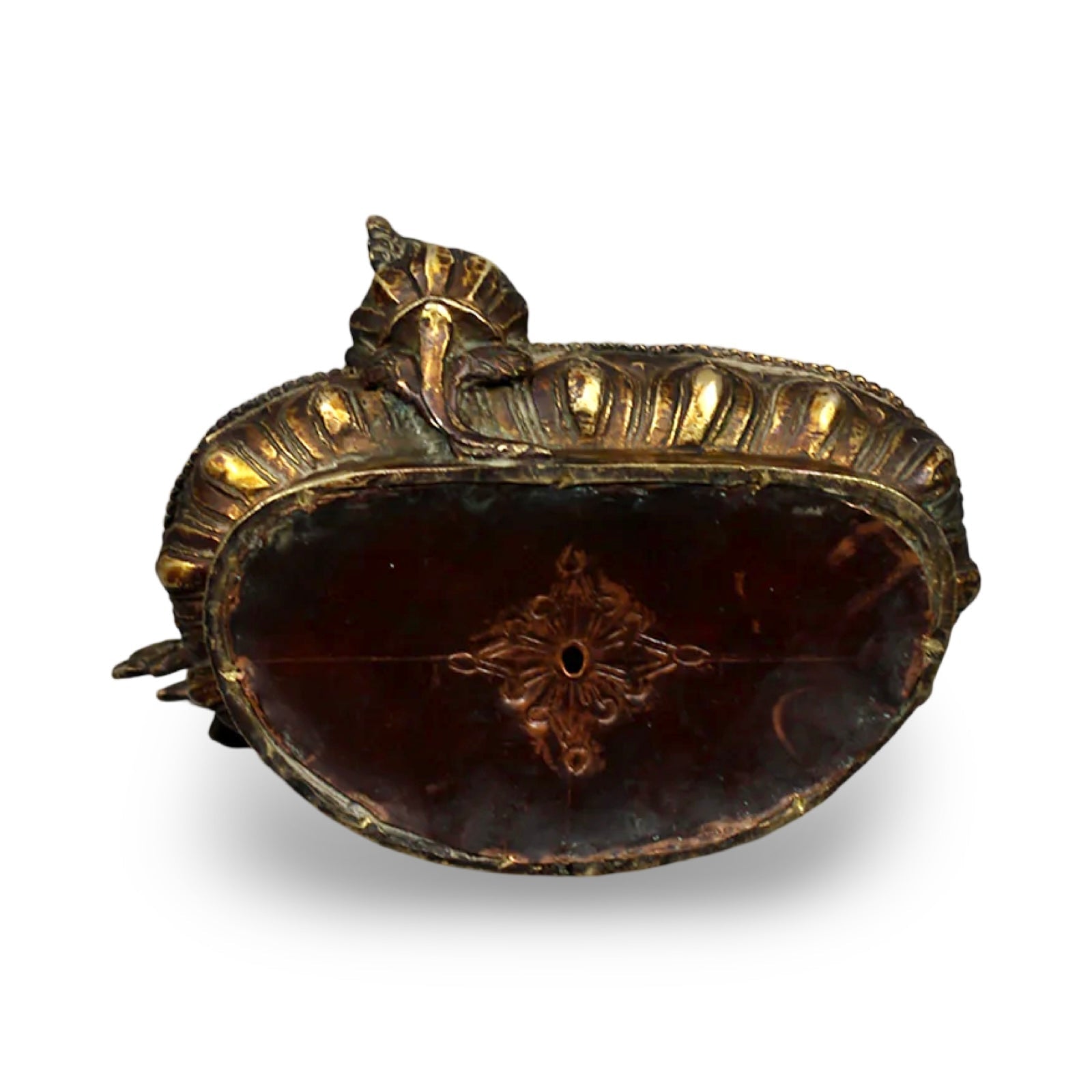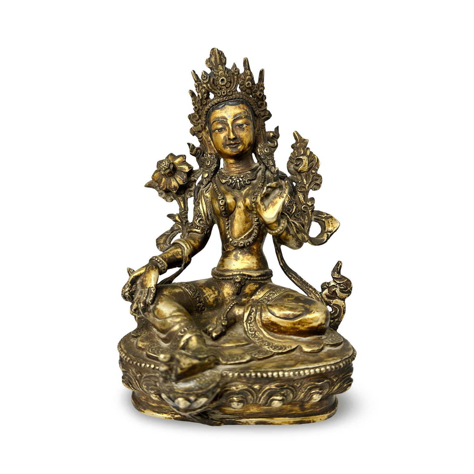 Vergoldete Kupferstatue «Grüne Tara» in antikem Stil mit Patina