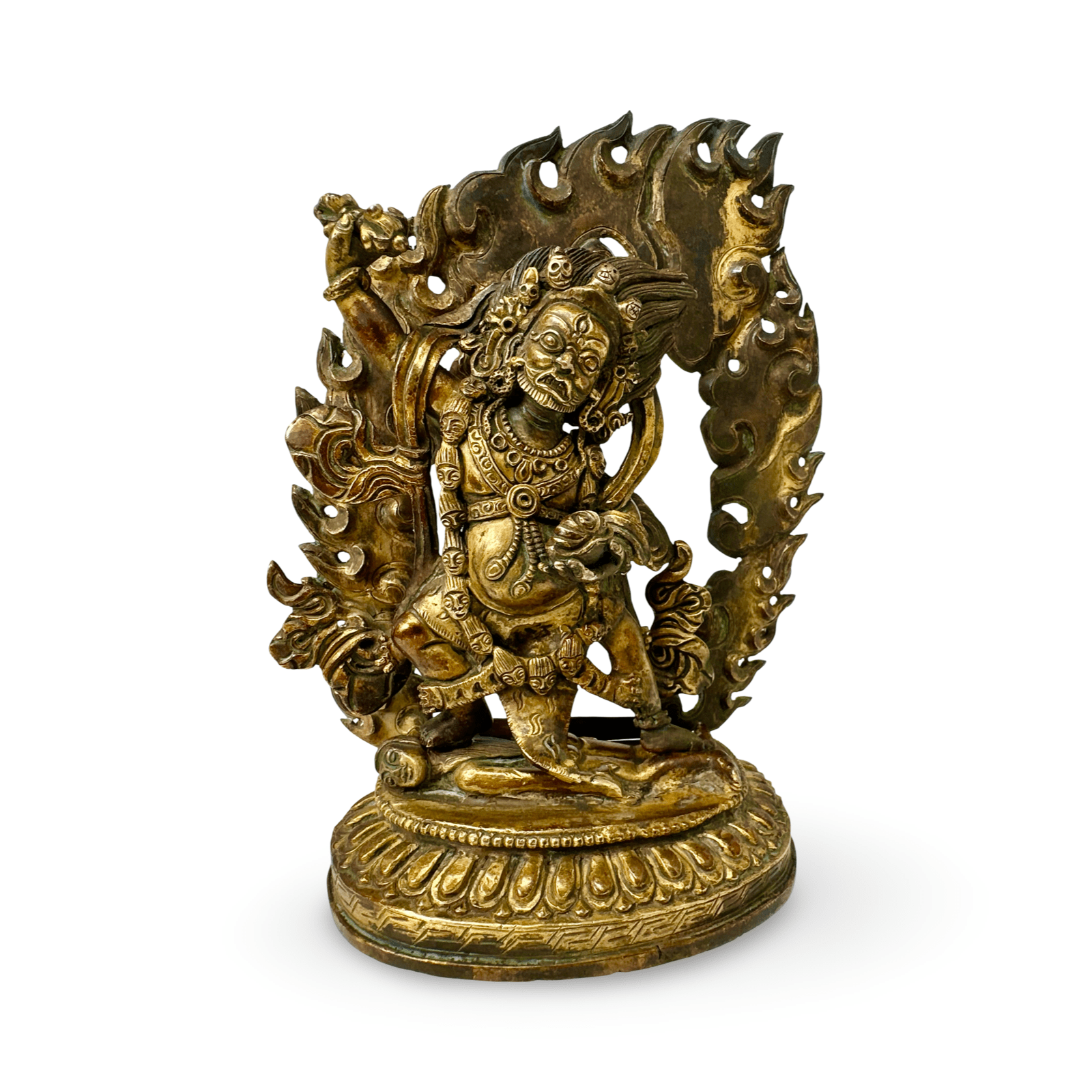 Diese Vajrapani-Statue zeigt den kraftvollen Beschützer des Buddha in einer dynamischen, zornvollen Darstellung der tibetisch-himalayischen Buddhakunst. Vajrapani steht in energischer Schrittstellung, umgeben von einer durchbrochen gearbeiteten Flammenaureole, die seine transformierende und schützende Energie symbolisiert. Der ausdrucksstarke Gesichtsausdruck mit hervortretenden Augen und wallendem Haar steht für die Überwindung von Unwissenheit und negativen Kräften.